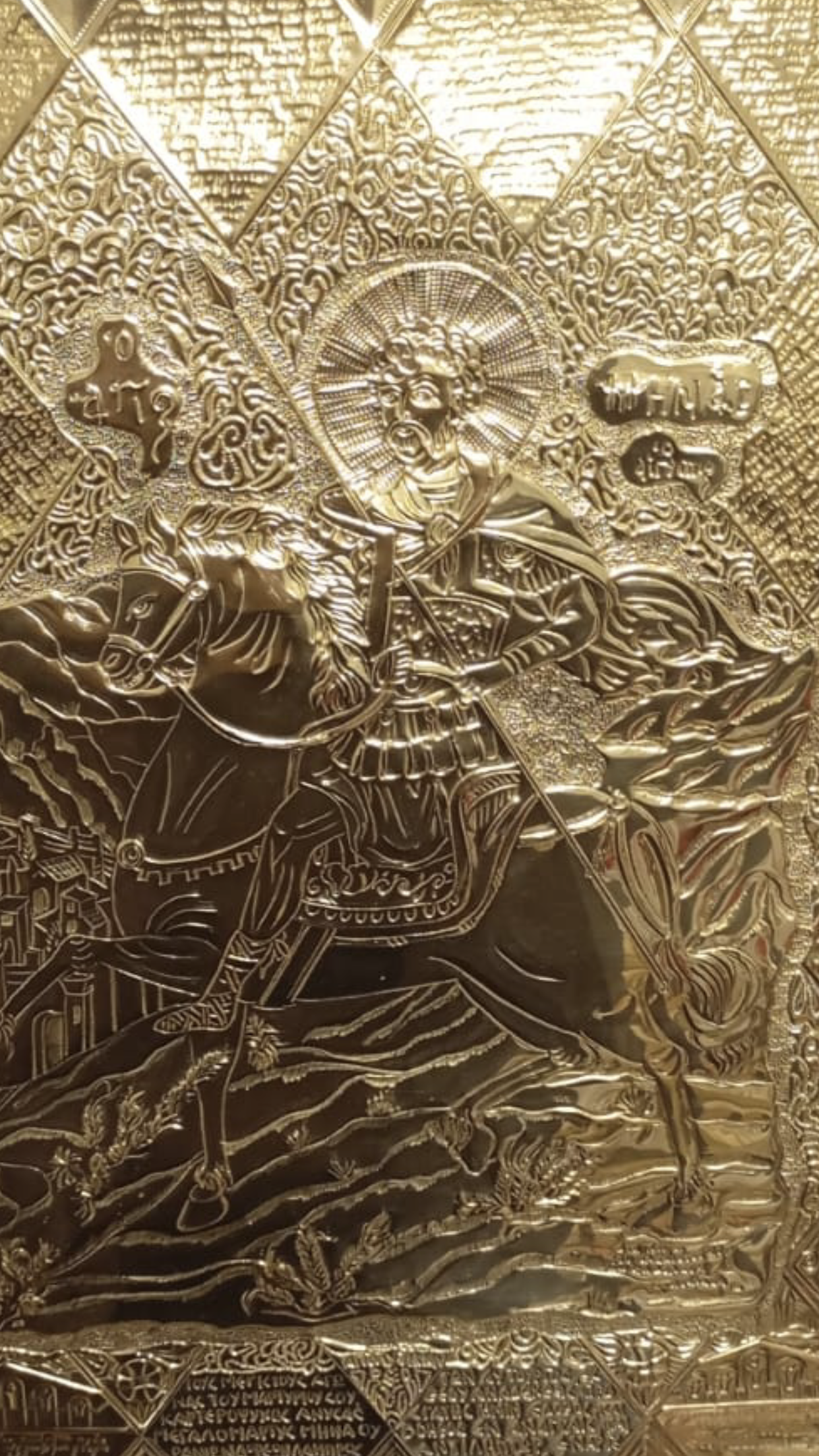 Engraved image of Saint Minas on silver foil, of Byzantine and Greek Orthodox religious art inspiration.
